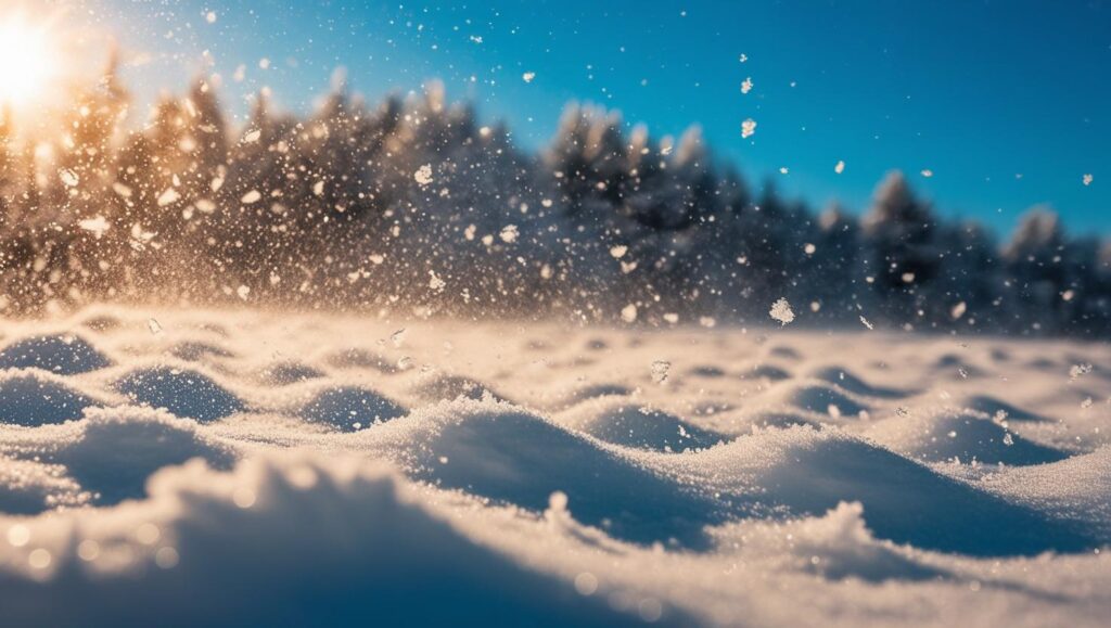 Wo dunkle Wolken das Firmament verhängen, da fallen Schneeflocken auf ihrem letzten Weg zum Boden herab. Es ist der Schneestaub, der sich von den Böen des Windes in die Ferne treiben lässt und sich dem Tanz mit den plötzlich durchbrechenden Sonnenstrahlen hingibt. Es ist der sonnengetränkte Schneestaub, der überdauert und das Antlitz des Winters schmückt.